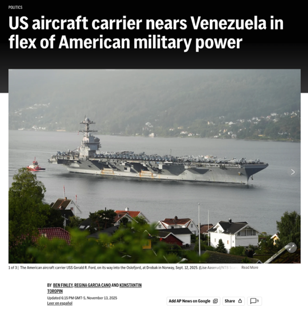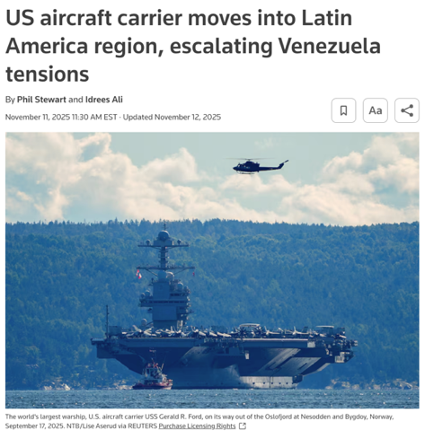 美联社报道,“福特”号航母将在数日内抵达委内瑞拉近海,美国的这种军事力量展示,在拉美已有数代人未曾见过。