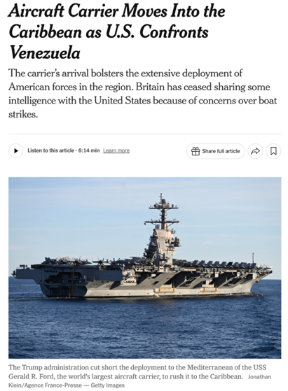 《纽约时报》报道,美国最先进的“福特”号航母日前进入加勒比海区域,美国政府正在考虑采取进一步军事行动,旨在推翻马杜罗政权。